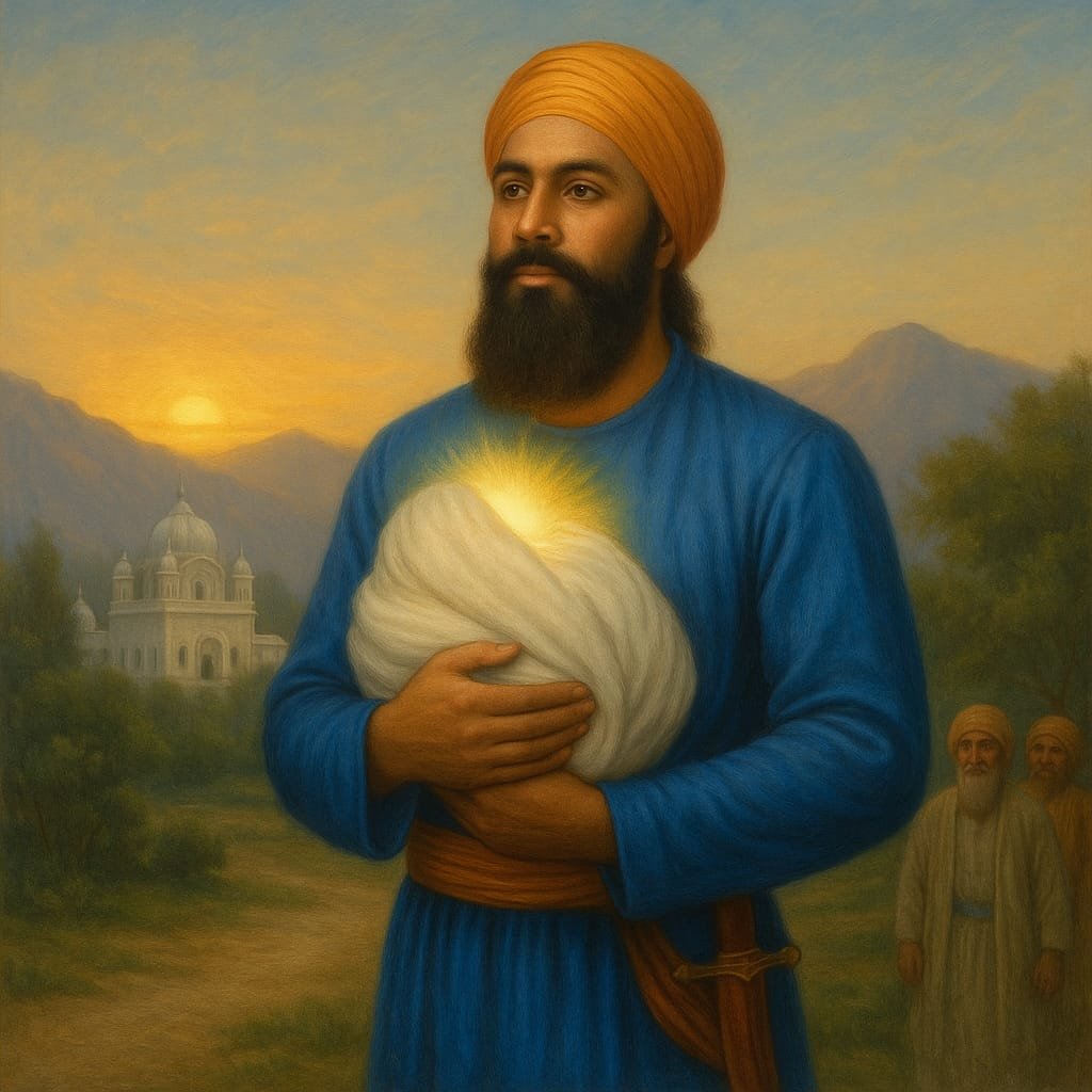 भाई जैता सिंह, नीली पोशाक में, दृढ़ कदमों से आगे बढ़ रहे थे।उनकी बाँहों में सफेद कपड़े में लिपटा हुआ गुरु तेग बहादुर जी का शीश था —जो स्वयं धर्म, साहस और बलिदान का प्रतीक बन चुका था।