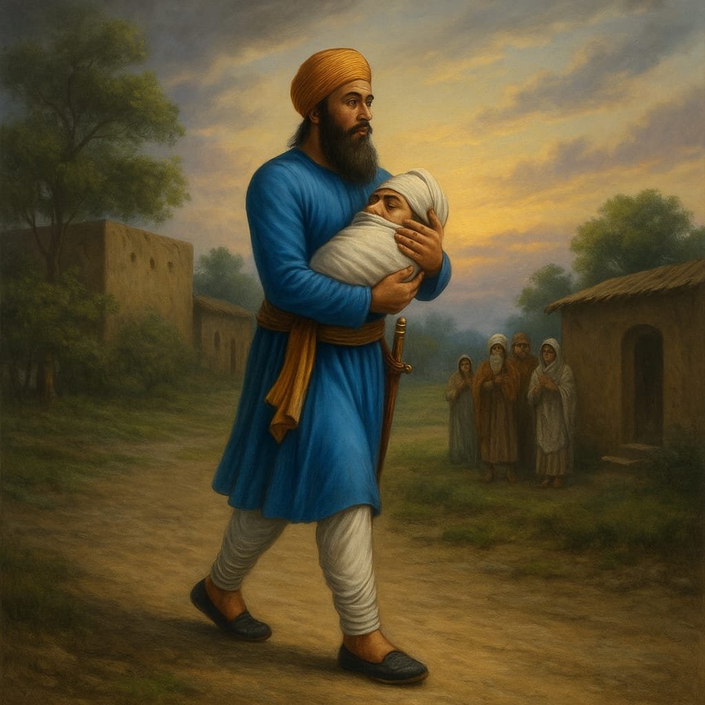 जब भाई जैता जी गांव के बाहर पहुँचे,उनके कपड़े धूल और खून से सने थे, चेहरा थकान से भरा,पर आँखों में अद्भुत तेज और श्रद्धा झलक रही थी।