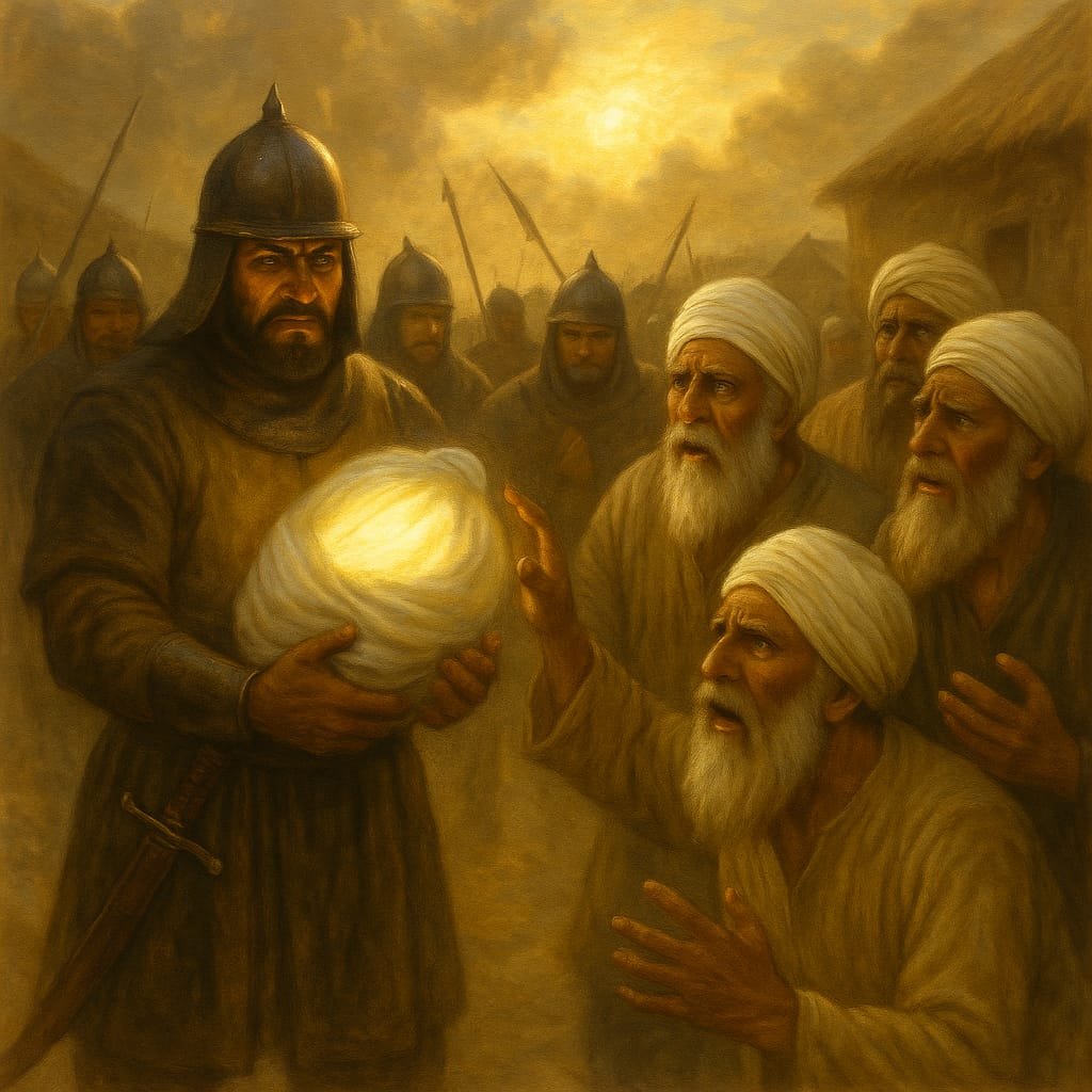 धुंधली सांझ थी।गांव की गलियों में धूल और भय दोनों तैर रहे थे।मुगल सैनिक तलवारें लहराते हुए गांव में दाखिल हुए।उनके सामने कुछ बुजुर्ग खड़े थे — थके हुए, पर दृढ़ थे।