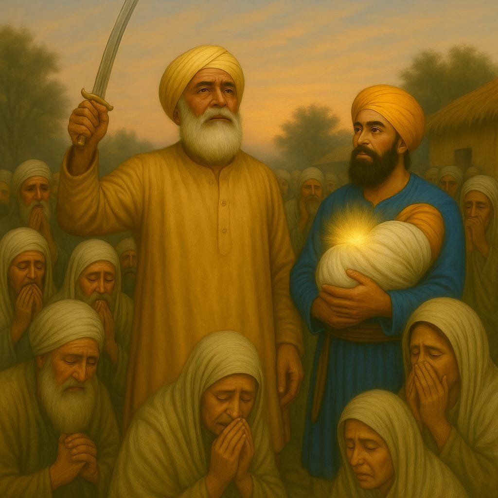 फिर एक क्षण ऐसा आया — जब पूरा वातावरण थम गया। हवा रुक गई, पत्ते स्थिर हो गए। दादा जी ने “वाहेगुरु” का नाम लिया और उसी क्षण उन्होंने अपनी तलवार स्वयं अपने गले पर चला दी।गांव के लोग दौड़े,किसी ने उनके शीश को गोद में लिया, किसी ने आंसुओं से उनके चरणों की धूल भिगो दी।हर चेहरे पर दर्द था, पर उस दर्द के पार गर्व और श्रद्धा की लहर उठ रही थी। ऐसा लग रहा था जैसे धरती भी इस बलिदान को नमन कर रही हो।