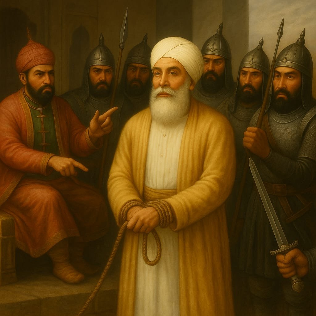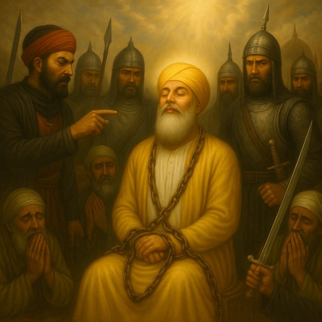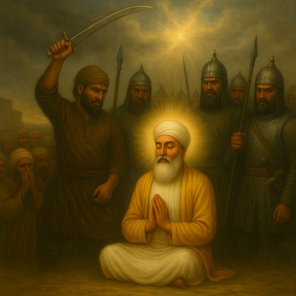 दिल्ली का चांदनी चौक, सुबह का समय।मुगल सैनिक चारों ओर खड़े हैं, तलवारें चमक रही हैं। गुरु तेग बहादुर जी को लोहे की जंजीरों में बांधा गया है, पर उनके चेहरे पर कोई भय नहीं — बस शांत तेज़ और दिव्यता।