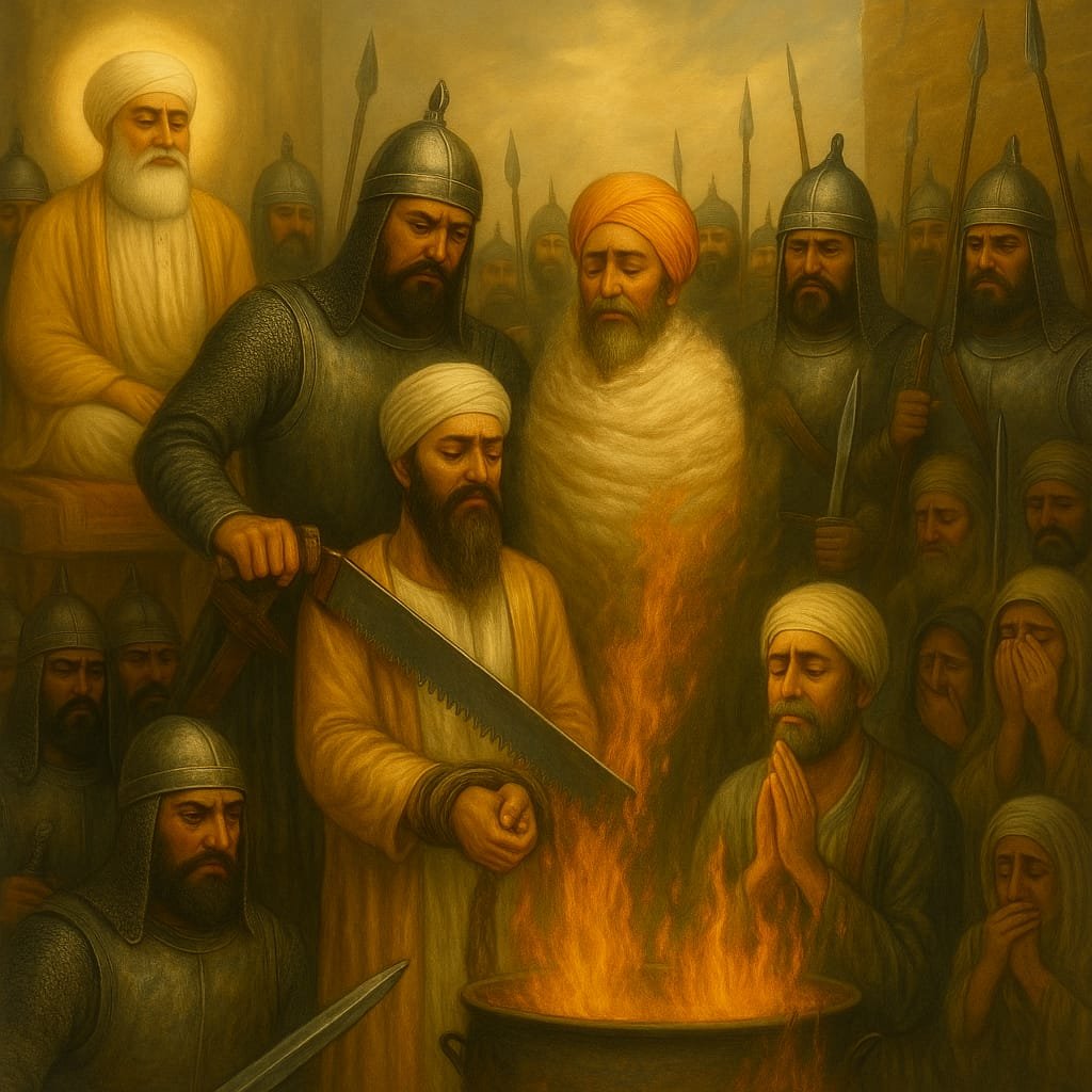 परंतु तीनों ने दृढ़ता से कहा —“हम अपने गुरु के साथ हैं, धर्म नहीं छोड़ेंगे।”मुगलों ने उन्हें भयानक यातनाएँ दीं —